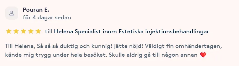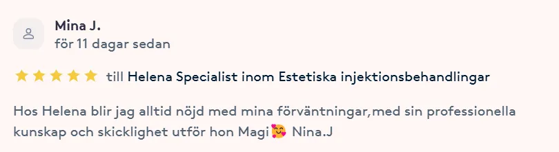 Jag är Certifierad specialist inom estetiska injektioner och har arbetat heltid med injektionsbehandlingar sedan 2012.